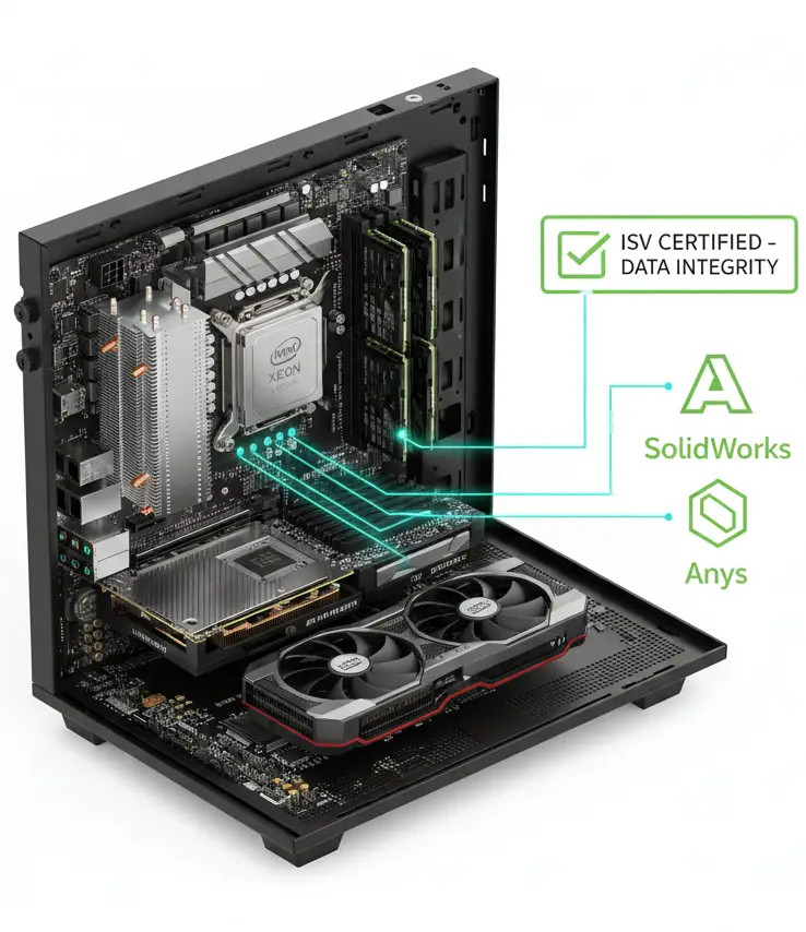 A memória Error Correcting Code (ECC) é vital para cálculos complexos e simulações de longa duração. Ela deteta e corrige automaticamente erros de bit único causados por interferências eletromagnéticas ou eventos aleatórios. Num PC comum, estes erros podem provocar um encerramento inesperado ou a corrupção silenciosa de dados; numa workstation de torre, o erro é corrigido em tempo real e o sistema continua a operar sem interrupções.